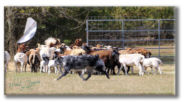 Bull is an intense worker. Much like the dogs I started with. He is a hard headed dog. He has not shown any preference on biting either end of a cow yet – he hits both. He can definitely stop something that keeps leaving the herd. On ewes with lambs he adjust to rate the stock movement without injuring any newborns. He is a dog that has a great sense of humor and loves to play tug, fetch, untie your shoe, keep away, and hide and seek. He is all boy. Bull was sold as a pup but when I got him back for training, I realized that he was a lot of dog for someone that had not trained a stockdog before. He wiggles into your heart quickly with his personality and pure talent on stock. He is friendly to people, loves children. Not a dog I’d trust with other males that are dominant. He won’t back down if challenged. I’m glad he will be standing at stud here --- but most of all, I get the chance to work and trial this talented dog.