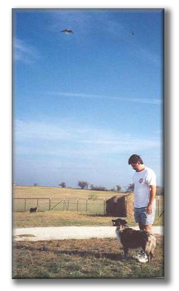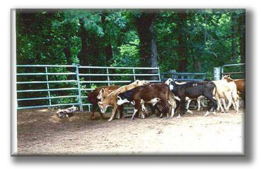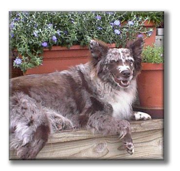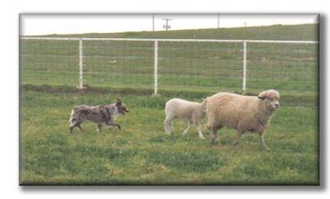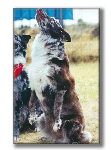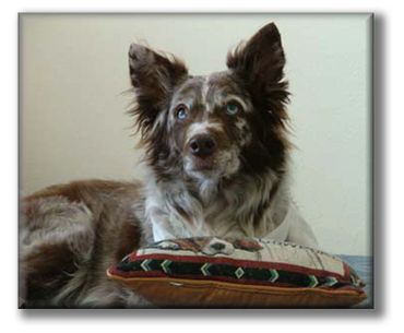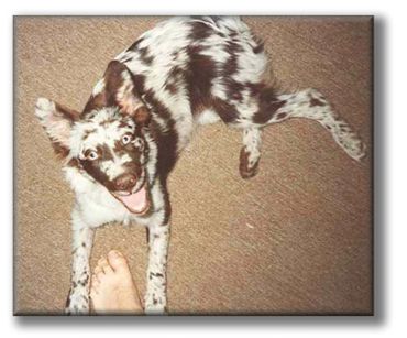 Karat is the foundation of the Cut'n Loose line. She is a liver/silver red merle with white. Her lineage carries the impressive dogs of the past such as HOF WTCH Slash V Slide Me Sweet (Slip)- doubled up, Taylor's Luke the Drifter, Jones's Reddy Teddy, Wood's Stubby, WTCH Oliver's Romulus Five and Powder River City Slicker. Karat is a protective, instinctive worker. She works quiet, except she will bark on the heads of cattle. She is a house dog, rides shotgun in the truck and can be a backseat driver. She has produced bigger than herself with each of the three males she was bred to. 1st cross was with Angel Flight's Cattle Cutter....ranch dogs, Stock and obedience titled kids, 2nd cross- HOF WTCH Deharo's 2-Bits.....dogs, in ranch homes, obedience, still trialing and some close to WTCHing, 3rd cross- 45 Ranch Rem's Cody, STDc....still trialing and ranch dogs. These pups will be the second generation and future of the Cut'n Loose Stockdog line. We do not breed often, we believe that in each cross is the future of the working aussie. We do not take this responsibility lightly! Physically and mentally sound working dogs are all we work toward. Karat has produced several WTCHes and multiple titled offspring.