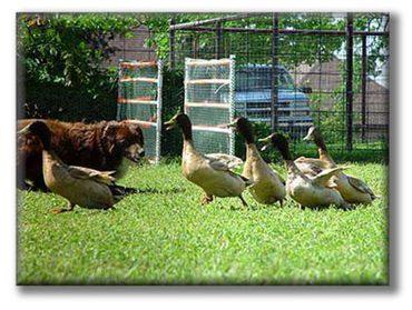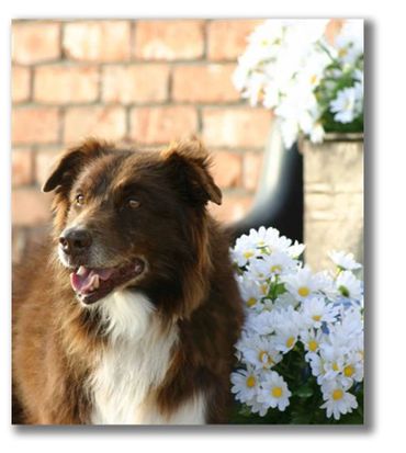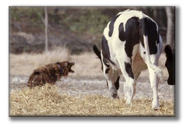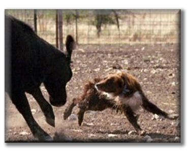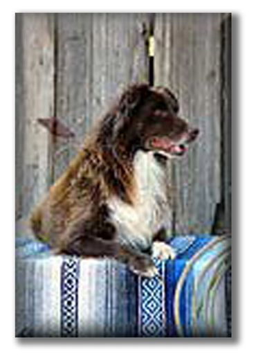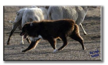 Ted was a littermate to Bitsy. He was a tough dog and loves to be around people. Ted was a toy dog, and loved his squeekies. He would protect his territory from other male dogs. He worked close but could be pushed out. He has pups titled in obedience, stock, agility and many on ranches. I like what I see in Ted's pups, they have his sweet temperament and athletic ability. At 12 weeks, they already have interest in stock. Ted stood out in a crowd because of his dark liver color and bright white. He was a really neat dog. He has been shown in conformation to judges that also work stockdogs, he enjoyed the trot and treat part. He has long been retired to yard protector, all the birds are required to land outside his yard, and that includes a no bunny zone.